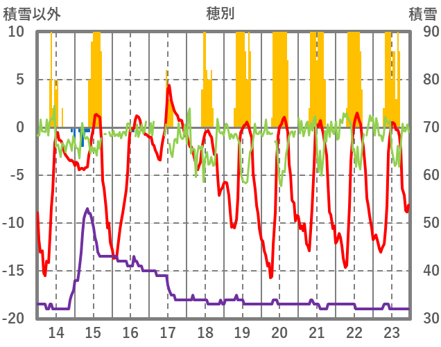 | 日 | 時 | 気温 | 降水 | 風向/風速 | 日照 | 積雪 | 降雪 |