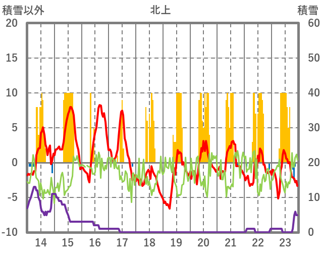 | 日 | 時 | 気温 | 降水 | 風向/風速 | 日照 | 積雪 | 降雪 |