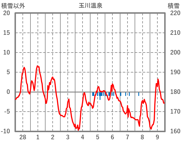 | 日 | 時 | 気温 | 降水 | 風向/風速 | 日照 | 積雪 | 降雪 |
