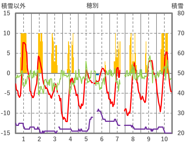 | 日 | 時 | 気温 | 降水 | 風向/風速 | 日照 | 積雪 | 降雪 |