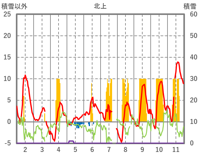 | 日 | 時 | 気温 | 降水 | 風向/風速 | 日照 | 積雪 | 降雪 |