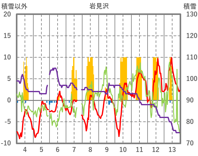 | 日 | 時 | 気温 | 降水 | 風向/風速 | 日照 | 積雪 | 降雪 |