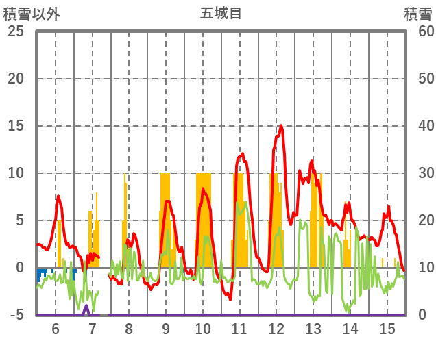 | 日 | 時 | 気温 | 降水 | 風向/風速 | 日照 | 積雪 | 降雪 |