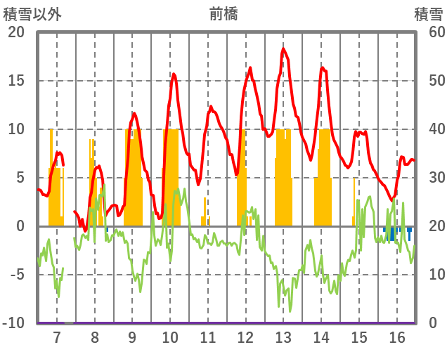 | 日 | 時 | 気温 | 降水 | 風向/風速 | 日照 | 積雪 | 降雪 |