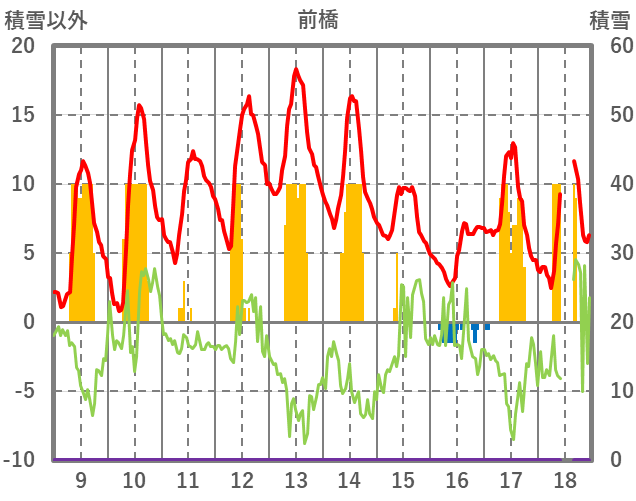 | 日 | 時 | 気温 | 降水 | 風向/風速 | 日照 | 積雪 | 降雪 |