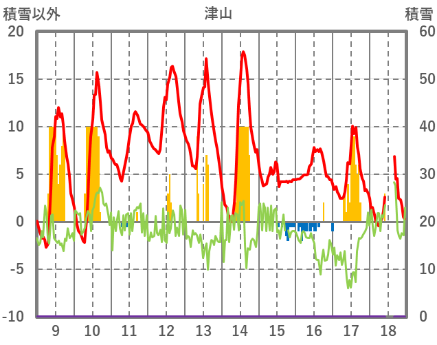 | 日 | 時 | 気温 | 降水 | 風向/風速 | 日照 | 積雪 | 降雪 |