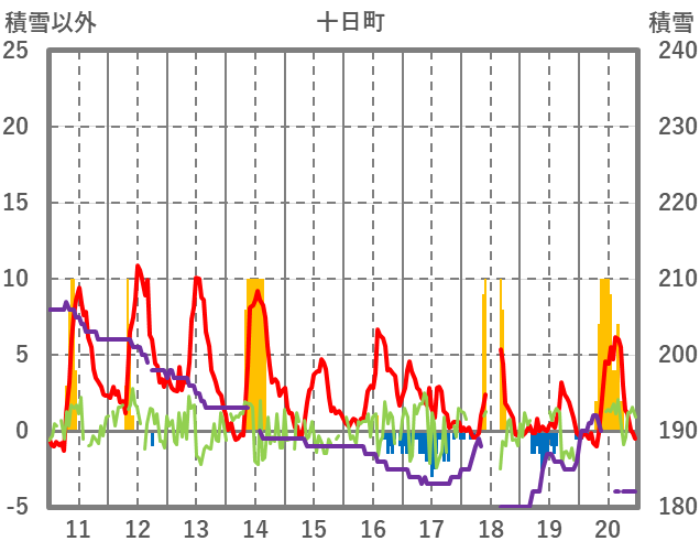| 日 | 時 | 気温 | 降水 | 風向/風速 | 日照 | 積雪 | 降雪 |