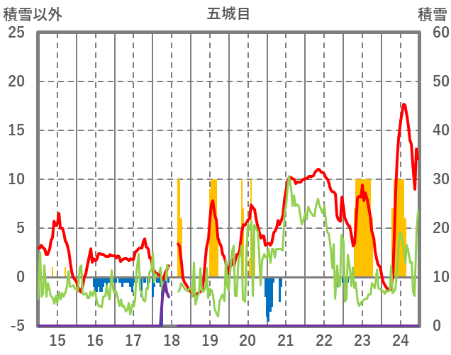 | 日 | 時 | 気温 | 降水 | 風向/風速 | 日照 | 積雪 | 降雪 |