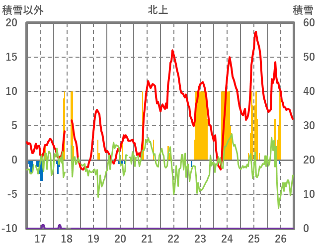 | 日 | 時 | 気温 | 降水 | 風向/風速 | 日照 | 積雪 | 降雪 |