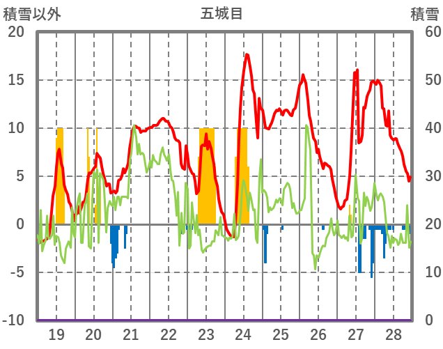 | 日 | 時 | 気温 | 降水 | 風向/風速 | 日照 | 積雪 | 降雪 |
