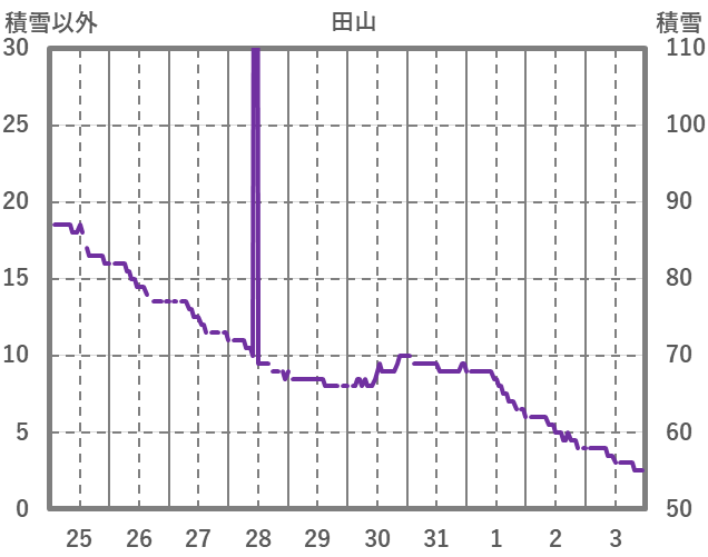| 日 | 時 | 気温 | 降水 | 風向/風速 | 日照 | 積雪 | 降雪 |