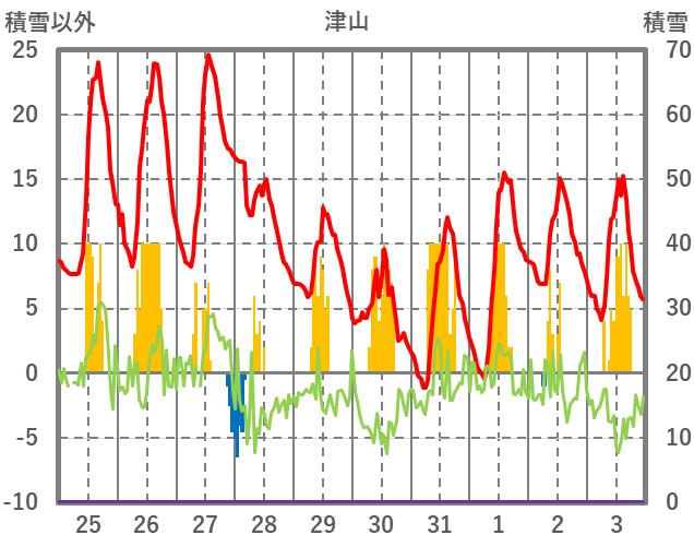 | 日 | 時 | 気温 | 降水 | 風向/風速 | 日照 | 積雪 | 降雪 |