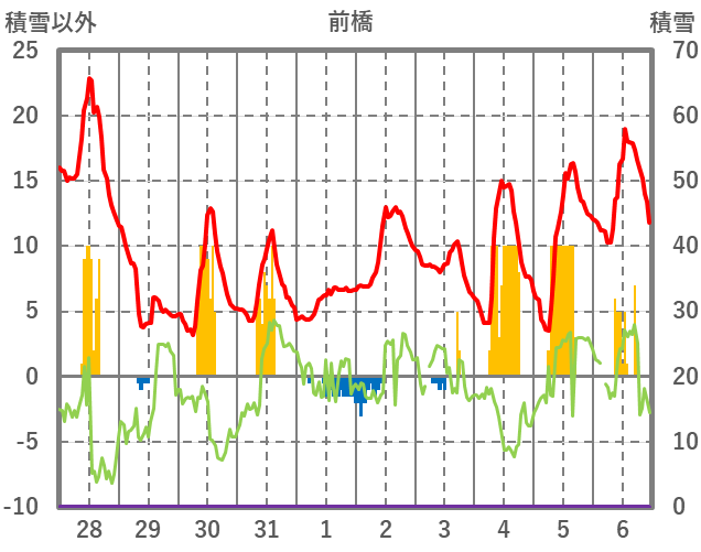 | 日 | 時 | 気温 | 降水 | 風向/風速 | 日照 | 積雪 | 降雪 |