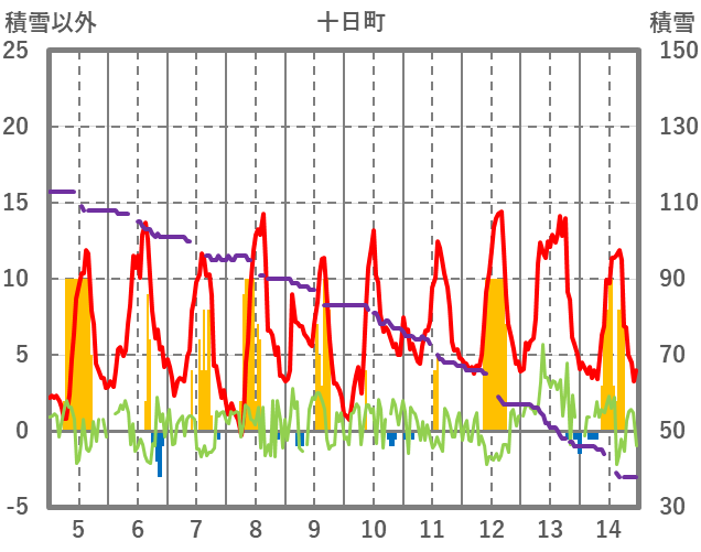 | 日 | 時 | 気温 | 降水 | 風向/風速 | 日照 | 積雪 | 降雪 |