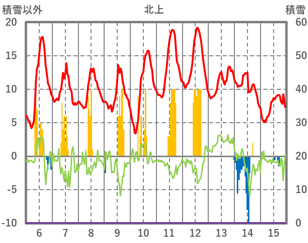 | 日 | 時 | 気温 | 降水 | 風向/風速 | 日照 | 積雪 | 降雪 |