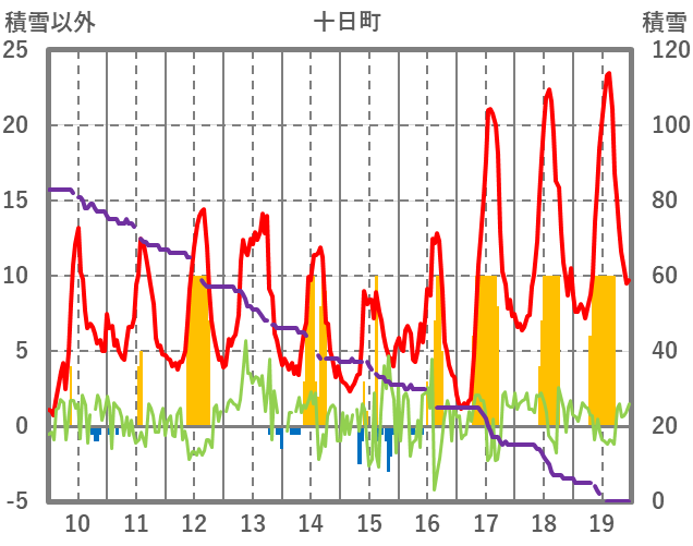 | 日 | 時 | 気温 | 降水 | 風向/風速 | 日照 | 積雪 | 降雪 |