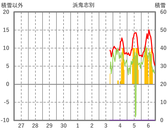 | 日 | 時 | 気温 | 降水 | 風向/風速 | 日照 | 積雪 | 降雪 |