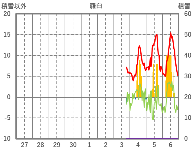 | 日 | 時 | 気温 | 降水 | 風向/風速 | 日照 | 積雪 | 降雪 |