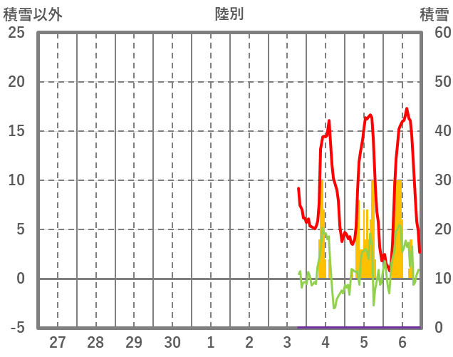 | 日 | 時 | 気温 | 降水 | 風向/風速 | 日照 | 積雪 | 降雪 |