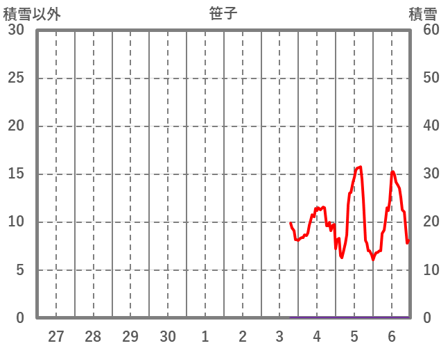 | 日 | 時 | 気温 | 降水 | 風向/風速 | 日照 | 積雪 | 降雪 |