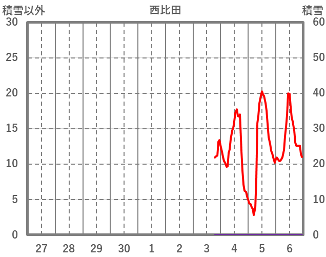 | 日 | 時 | 気温 | 降水 | 風向/風速 | 日照 | 積雪 | 降雪 |