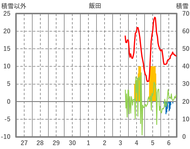 | 日 | 時 | 気温 | 降水 | 風向/風速 | 日照 | 積雪 | 降雪 |
