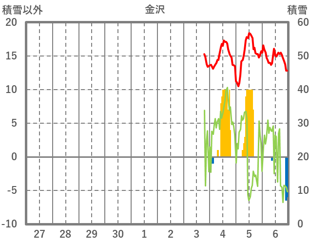 | 日 | 時 | 気温 | 降水 | 風向/風速 | 日照 | 積雪 | 降雪 |
