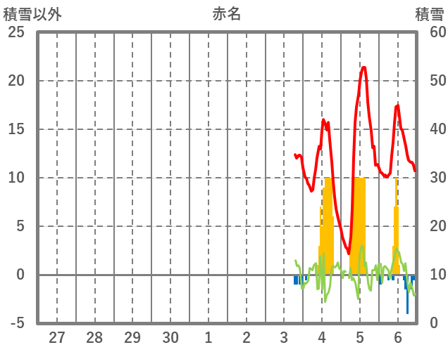 | 日 | 時 | 気温 | 降水 | 風向/風速 | 日照 | 積雪 | 降雪 |