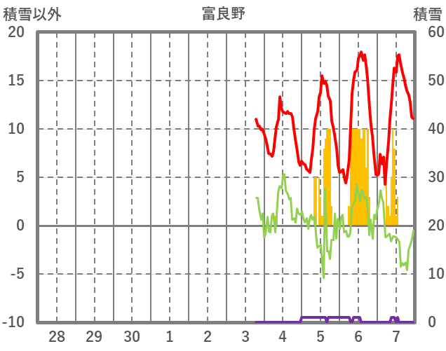 | 日 | 時 | 気温 | 降水 | 風向/風速 | 日照 | 積雪 | 降雪 |