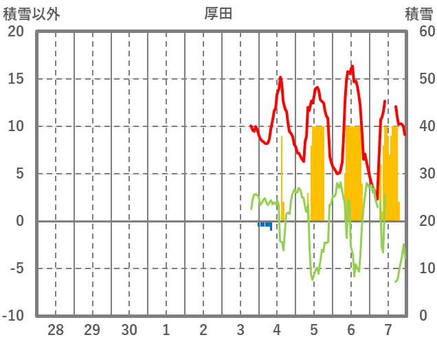 | 日 | 時 | 気温 | 降水 | 風向/風速 | 日照 | 積雪 | 降雪 |