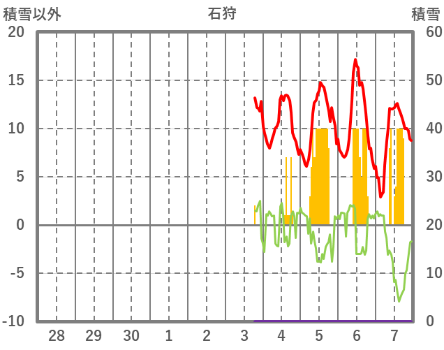 | 日 | 時 | 気温 | 降水 | 風向/風速 | 日照 | 積雪 | 降雪 |