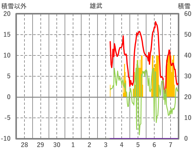 | 日 | 時 | 気温 | 降水 | 風向/風速 | 日照 | 積雪 | 降雪 |