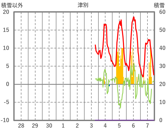 | 日 | 時 | 気温 | 降水 | 風向/風速 | 日照 | 積雪 | 降雪 |