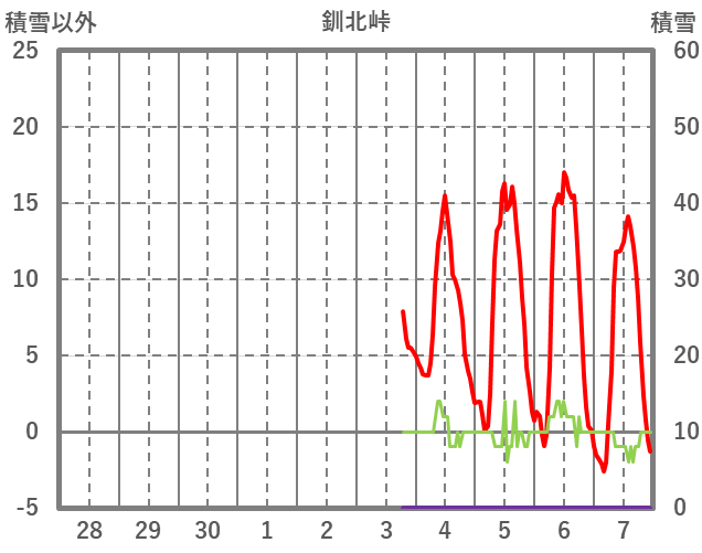 | 日 | 時 | 気温 | 降水 | 風向/風速 | 日照 | 積雪 | 降雪 |