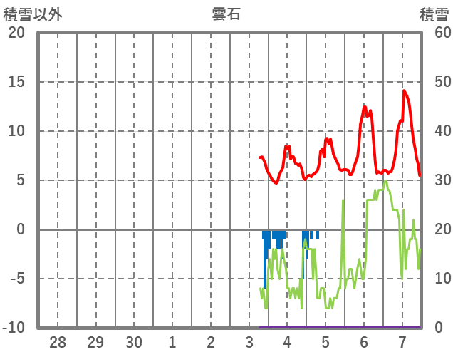 | 日 | 時 | 気温 | 降水 | 風向/風速 | 日照 | 積雪 | 降雪 |