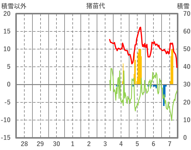 | 日 | 時 | 気温 | 降水 | 風向/風速 | 日照 | 積雪 | 降雪 |