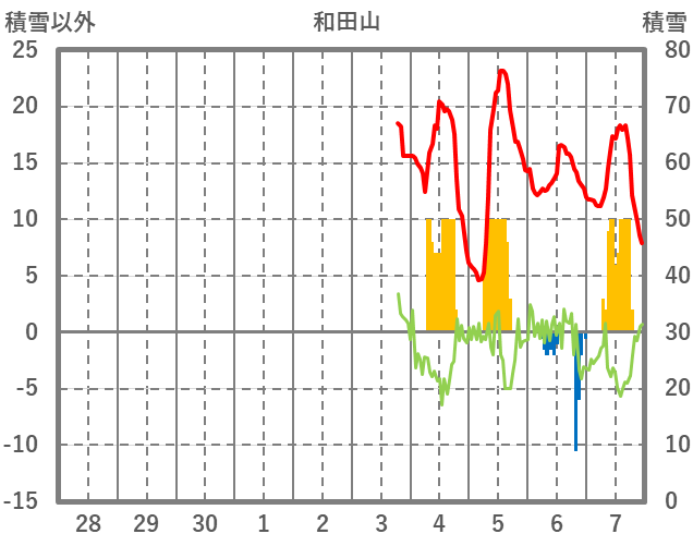 | 日 | 時 | 気温 | 降水 | 風向/風速 | 日照 | 積雪 | 降雪 |
