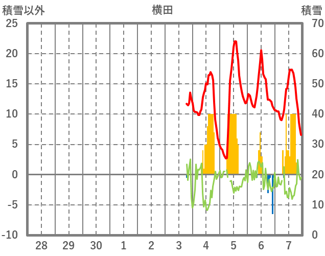 | 日 | 時 | 気温 | 降水 | 風向/風速 | 日照 | 積雪 | 降雪 |
