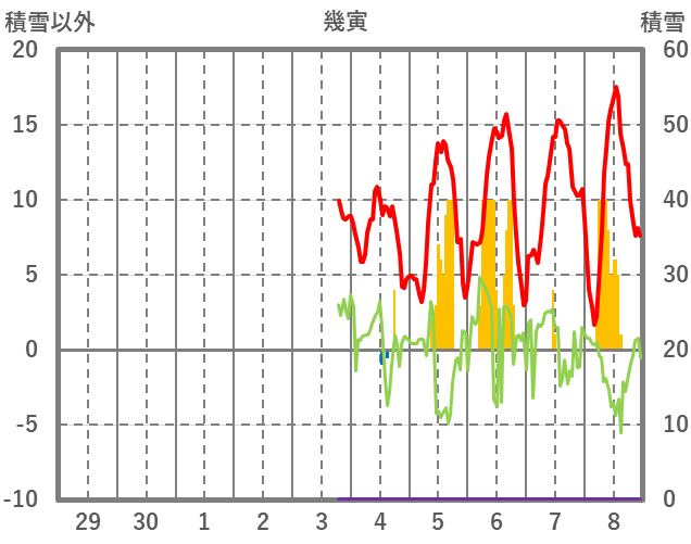 | 日 | 時 | 気温 | 降水 | 風向/風速 | 日照 | 積雪 | 降雪 |