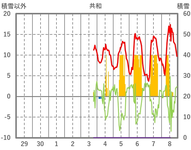 | 日 | 時 | 気温 | 降水 | 風向/風速 | 日照 | 積雪 | 降雪 |