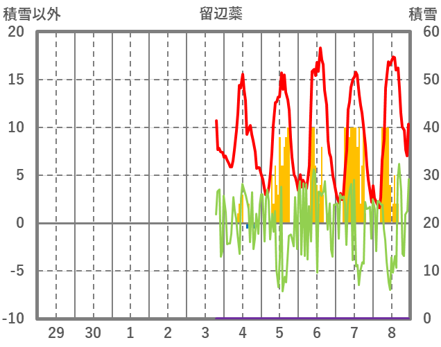 | 日 | 時 | 気温 | 降水 | 風向/風速 | 日照 | 積雪 | 降雪 |