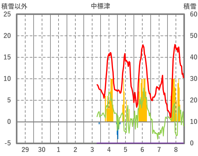 | 日 | 時 | 気温 | 降水 | 風向/風速 | 日照 | 積雪 | 降雪 |