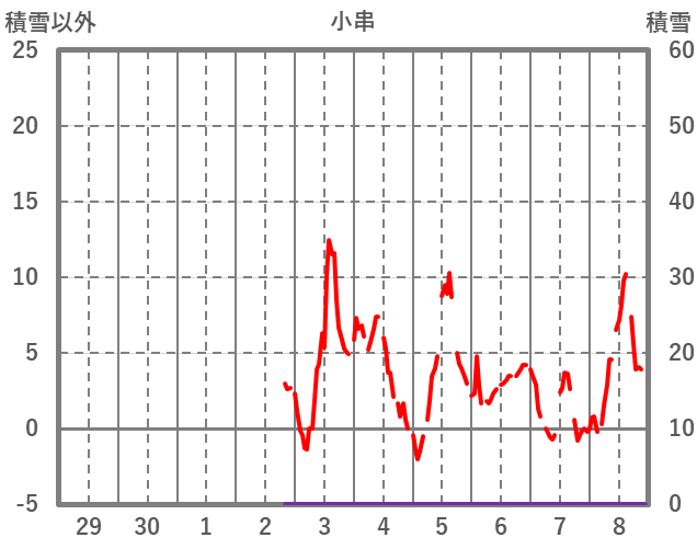 | 日 | 時 | 気温 | 降水 | 風向/風速 | 日照 | 積雪 | 降雪 |