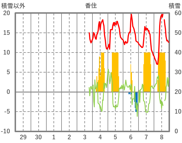| 日 | 時 | 気温 | 降水 | 風向/風速 | 日照 | 積雪 | 降雪 |