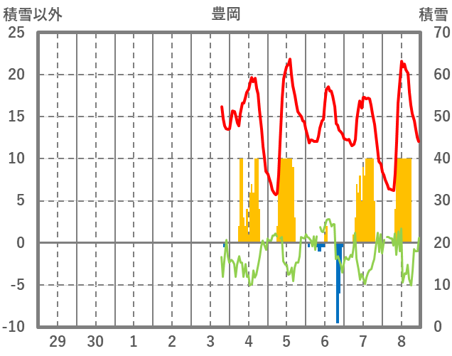| 日 | 時 | 気温 | 降水 | 風向/風速 | 日照 | 積雪 | 降雪 |
