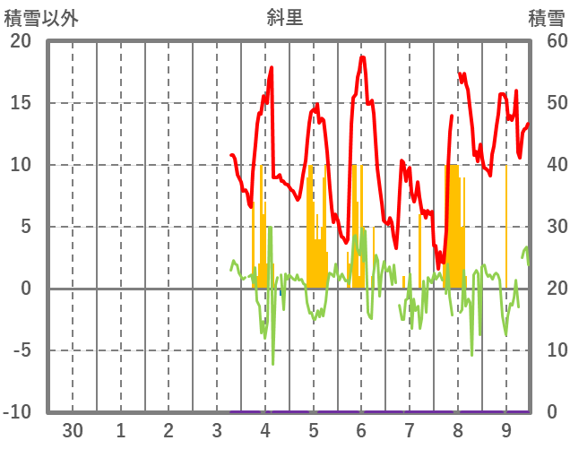 | 日 | 時 | 気温 | 降水 | 風向/風速 | 日照 | 積雪 | 降雪 |