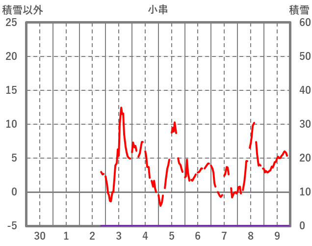 | 日 | 時 | 気温 | 降水 | 風向/風速 | 日照 | 積雪 | 降雪 |