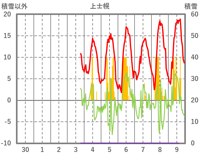 | 日 | 時 | 気温 | 降水 | 風向/風速 | 日照 | 積雪 | 降雪 |