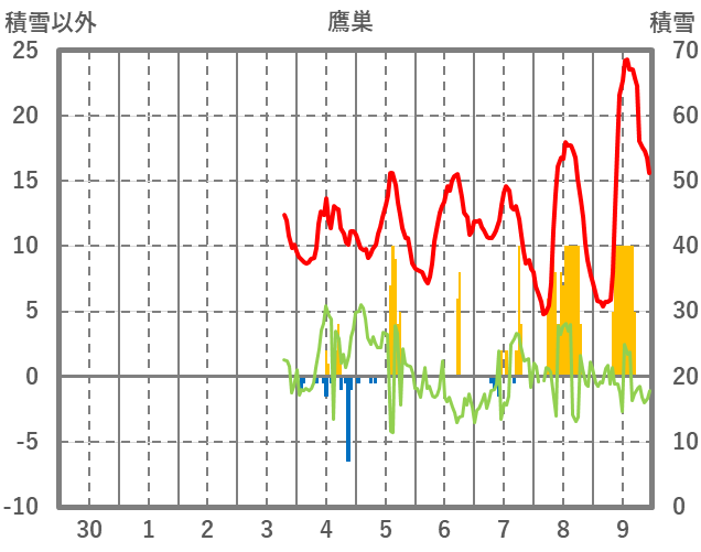 | 日 | 時 | 気温 | 降水 | 風向/風速 | 日照 | 積雪 | 降雪 |