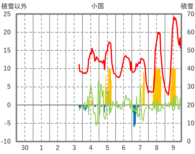 | 日 | 時 | 気温 | 降水 | 風向/風速 | 日照 | 積雪 | 降雪 |